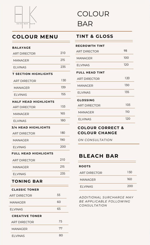 Please note: All colour services must be booked with a finishing service – choose from Haircut & Finish, Blow Dry, or Rough Dry.